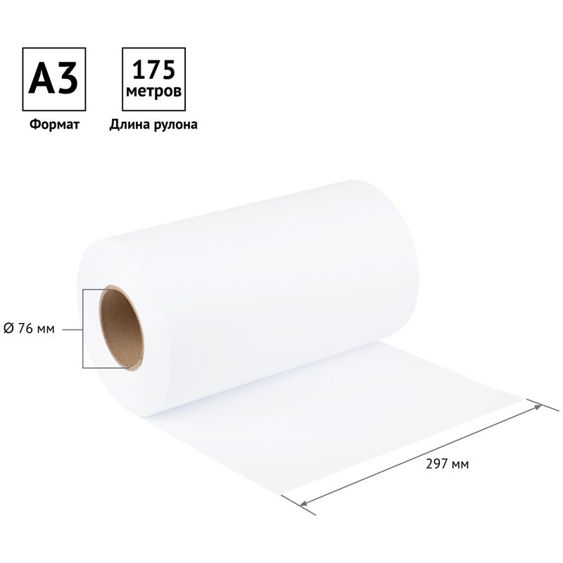 Размер бумажного полотна составляет 297 мм, что соответствует формату А3. Длина рулона - 175 м. Внутренний диаметр втулки - 76 мм.