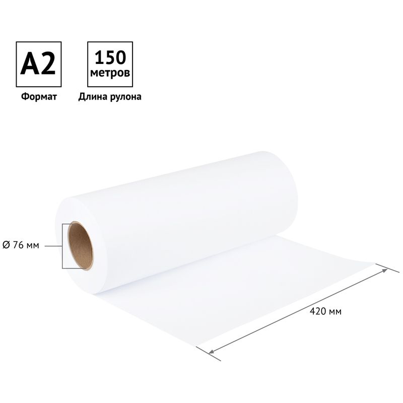 Размер бумажного полотна составляет 420 мм, что соответствует формату А2. Длина рулона - 150 м. Внутренний диаметр втулки - 76 мм.
