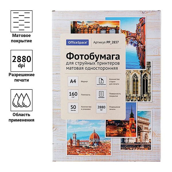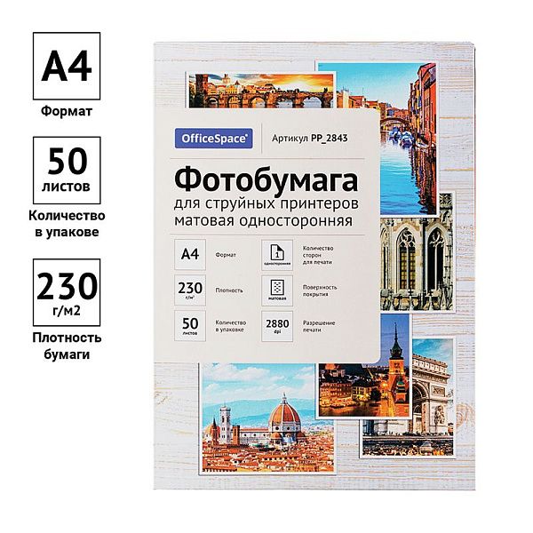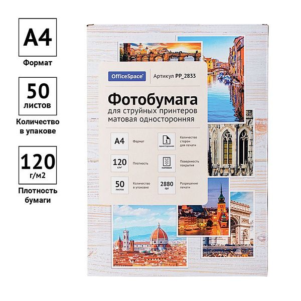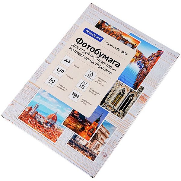 Подробности и характеристики: Фотобумага в формате A4 имеет плотность 170 г/м². Поверхность матовая, позволяет двустороннюю печать. В пачке 50 листов, что удобно для небольших тиражей. Это модель от бренда OfficeSpace для струйных принтеров.