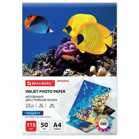 Подробности и характеристики: Фотобумага глянцевая имеет формат A4. Её плотность составляет 115 г/м². Поверхность предназначена для односторонней печати. В пачке находится 50 листов. Бренд - Brauberg, серия Original.