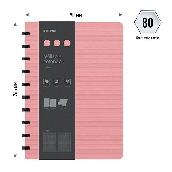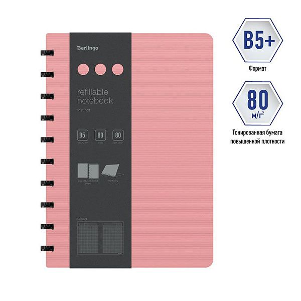 Бизнес-тетрадь В5+, 80л., Berlingo "Instinct", клетка, на кольцах, с возм. зам. блока, 80г/м2, пластик. (полифом) обл., линейка-заклад., фламинго/чер.