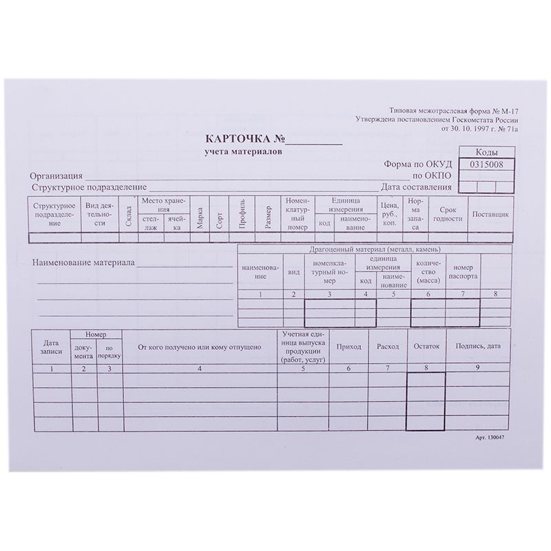 Бланк "Карточка складского учета материалов" OfficeSpace, А5 (форма М-17) 50 экз., в пленке т/у