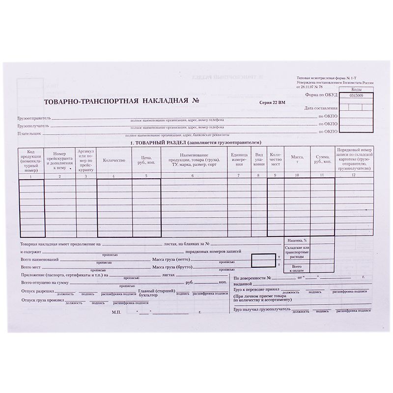 Бланк "Товарно-транспортная накладная" OfficeSpace, А4 (форма 1-Т) оборотный, газетка, 100 экз.
