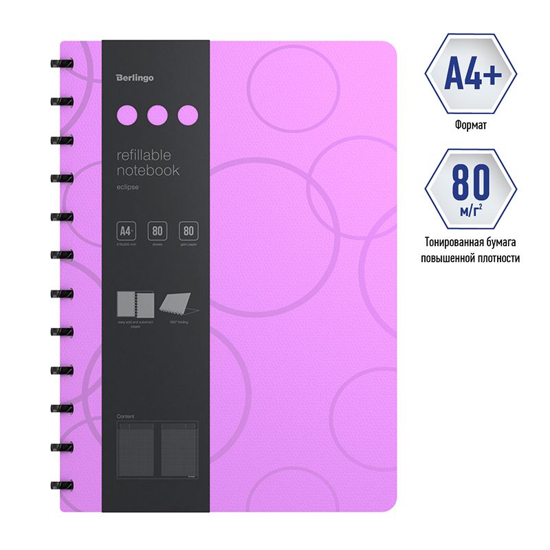 Бизнес-тетрадь А4+, 80л., Berlingo "Eclipse", клетка, на кольцах, с возм. замены блока, 80г/м2, пластик. (полифом) обложка, линейка-закладка, фиолетов