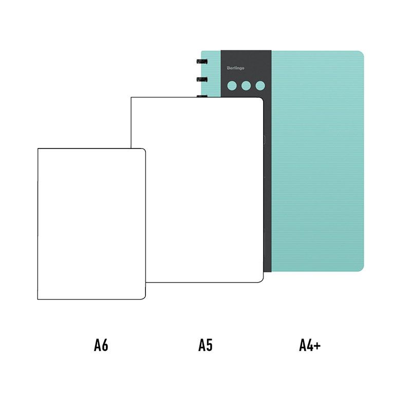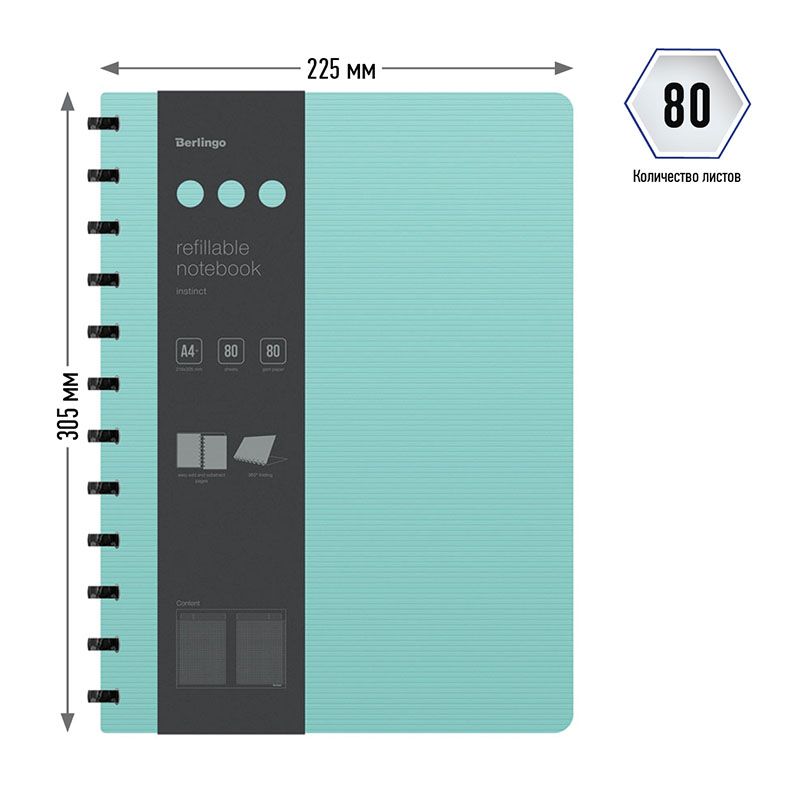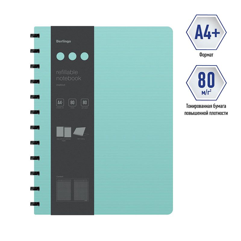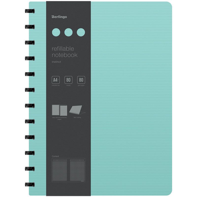 Бизнес-тетрадь А4+, 80л., Berlingo "Instinct", клетка, на кольцах,с возм. зам. блока, 80г/м2, пластик. (полифом) обл., линейка-закладка, мятный/черный