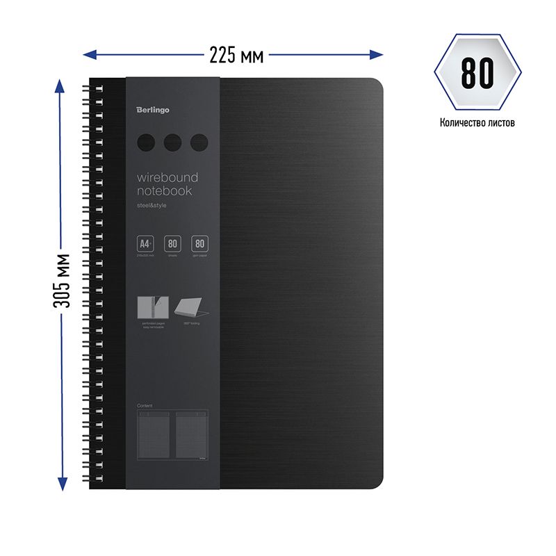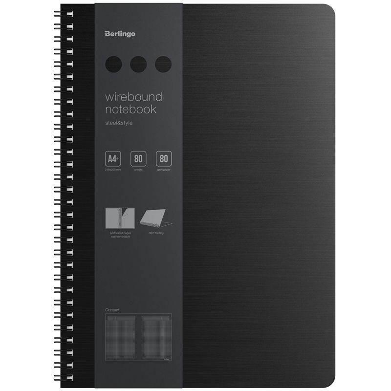 Бизнес-тетрадь А4+, 80л., Berlingo "Steel&Style", клетка, на гребне, 80г/м2, пластик. (полифом) обложка, линейка-закладка, черная