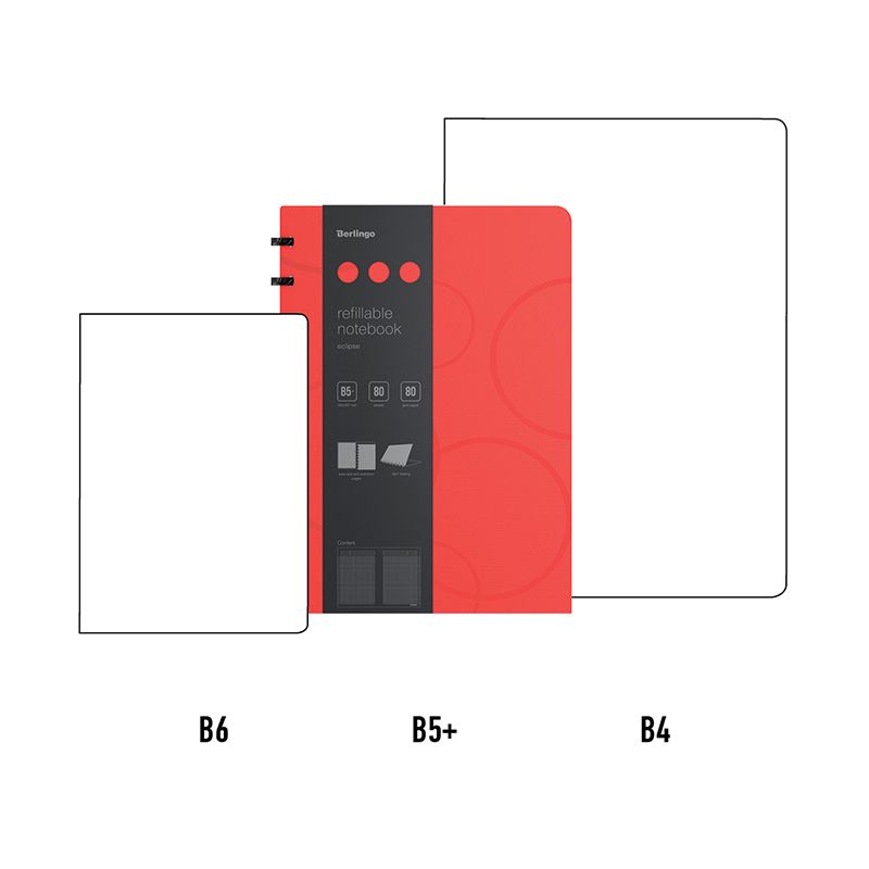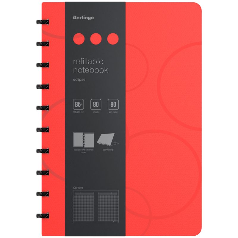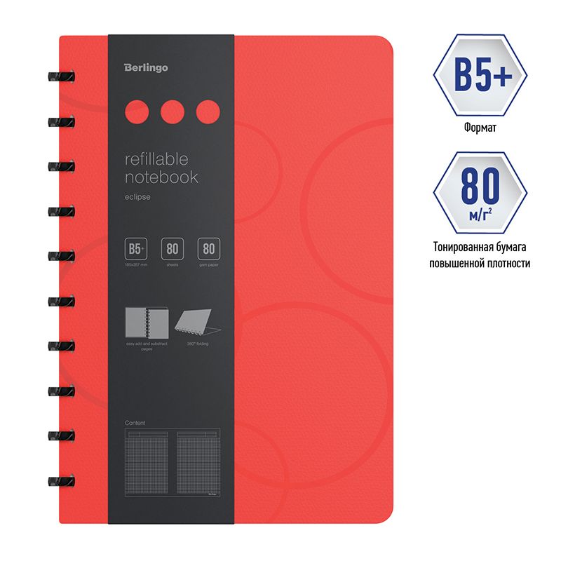Бизнес-тетрадь В5+, 80л., Berlingo "Eclipse", клетка, на кольцах, с возм. замены блока, 80г/м2, пластик. (полифом) обложка, линейка-закладка, красная