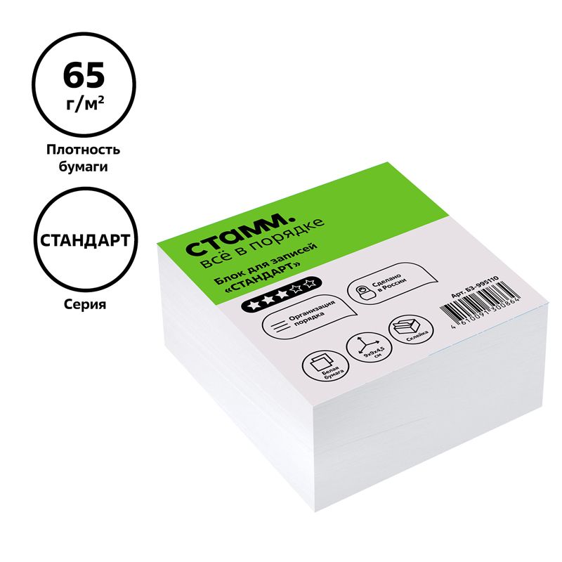 Блок для записей на склейке СТАММ "Стандарт", 9*9*4,5см, белый