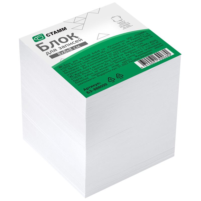 Блок для записей СТАММ, 8*8*8см, белый, белизна 65-70%