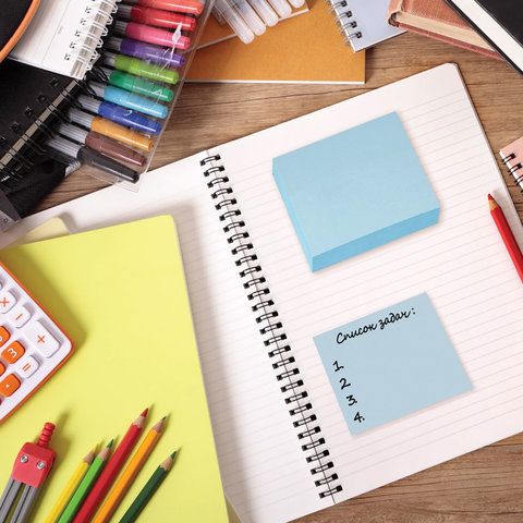 • Блок самоклеящийся Brauberg: надежный клей, голубые и цветные варианты.