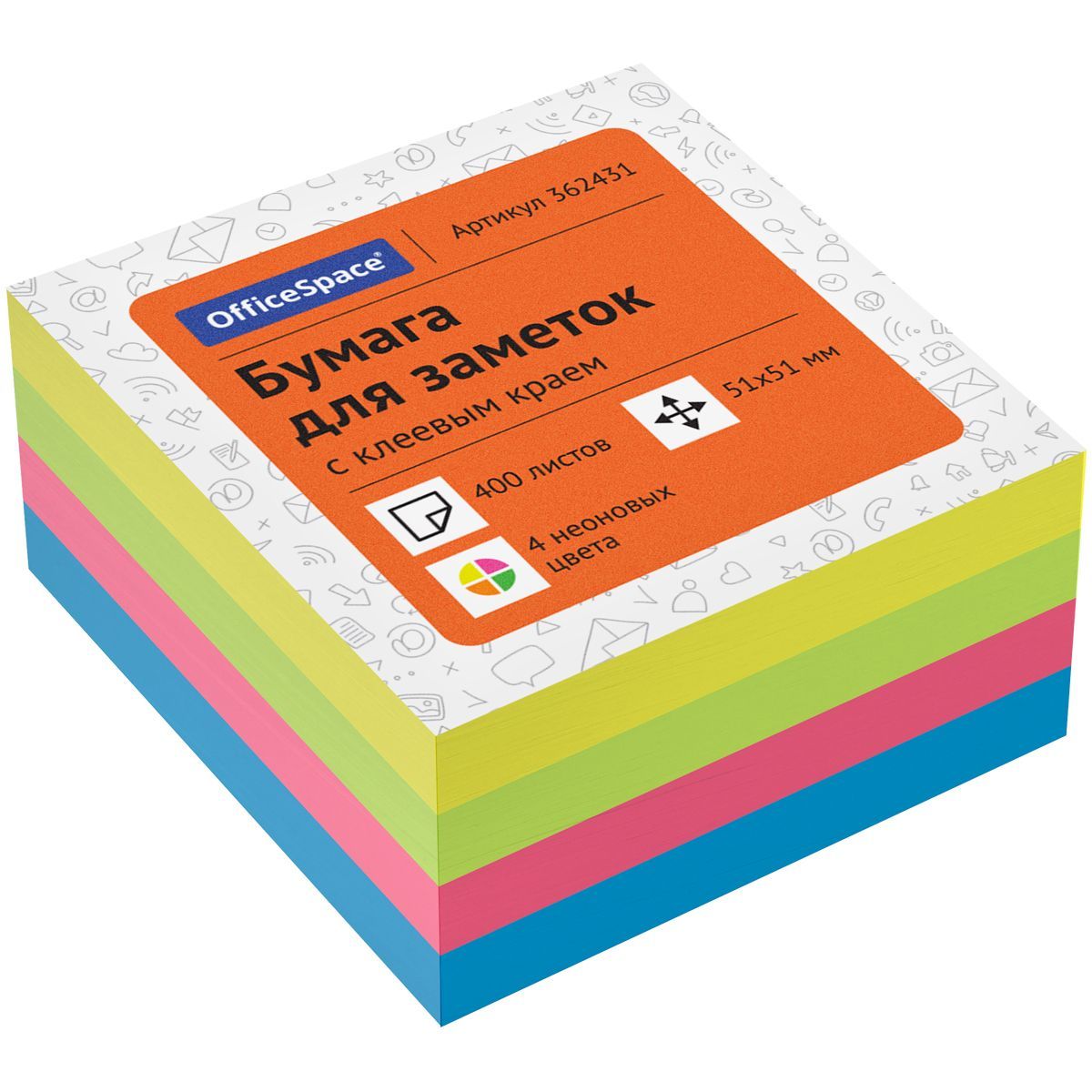 Самоклеящийся блок OfficeSpace, 51*51мм, 400л., 4 неоновых цвета