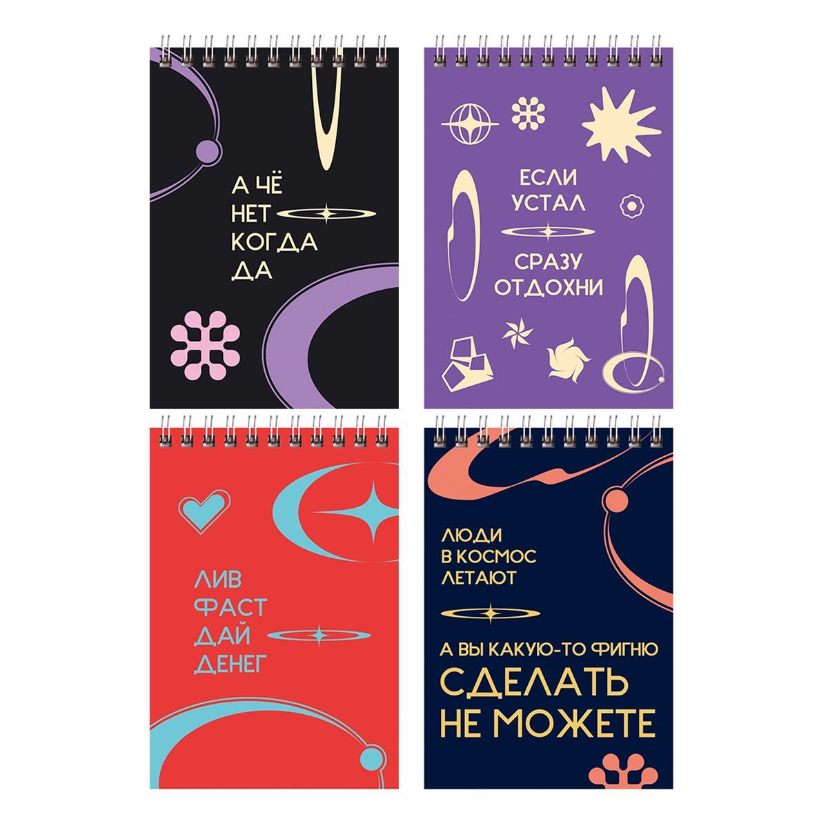 Блокнот с забавными надписями на обложке представлен в четырёх вариантах дизайна. Изделия поставляются в термоусадочной плёнке комплектом из 24 штук.