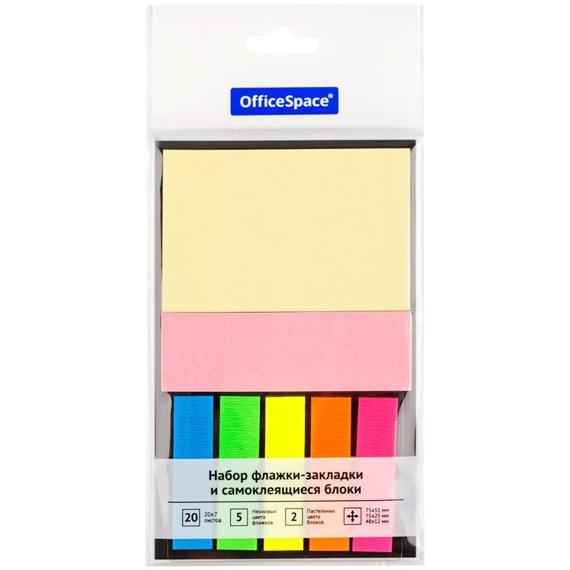 Флажки-закладки и самоклеящиеся блоки в наборе OfficeSpace, 48*12мм* 5цв., 75*51мм*1цв., 75*25мм *1цв., по 20л., неоновые цвета флажков