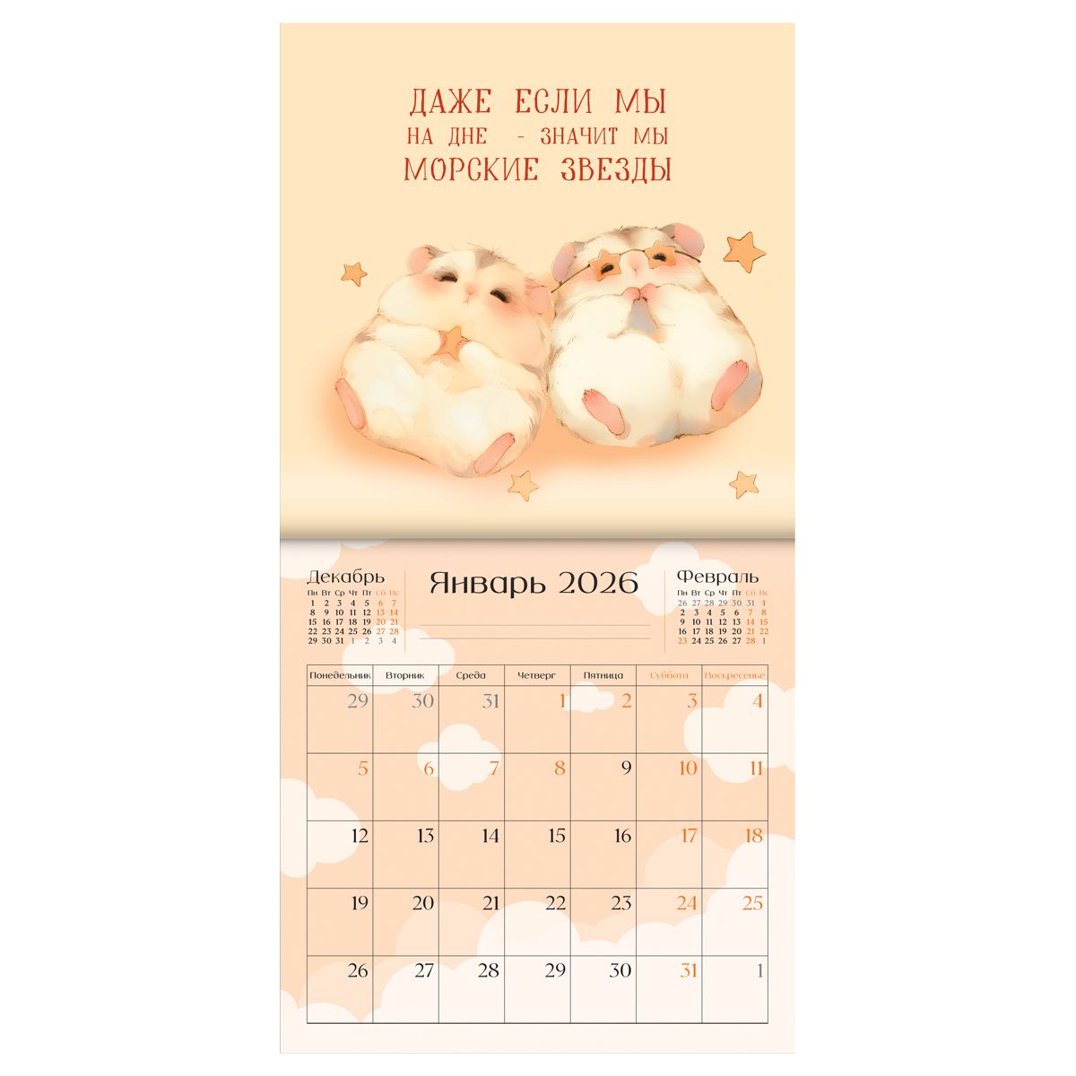 Каждый из 12 месяцев оформлен уникальными иллюстрациями, что создаёт вдохновляющую атмосферу. Оптимальный размер календаря позволяет легко разместить его в помещении, а надежная скрепка обеспечивает простоту в использовании. Индивидуальная упаковка — пакет.