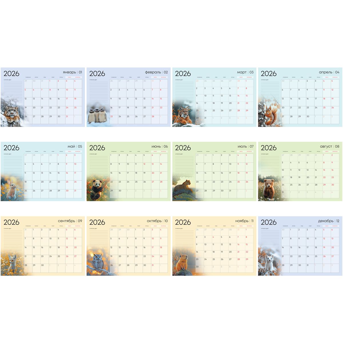 Календарь-планер настенный перекидной на гребне, А3, 12л. BG "Животные", 2026г.