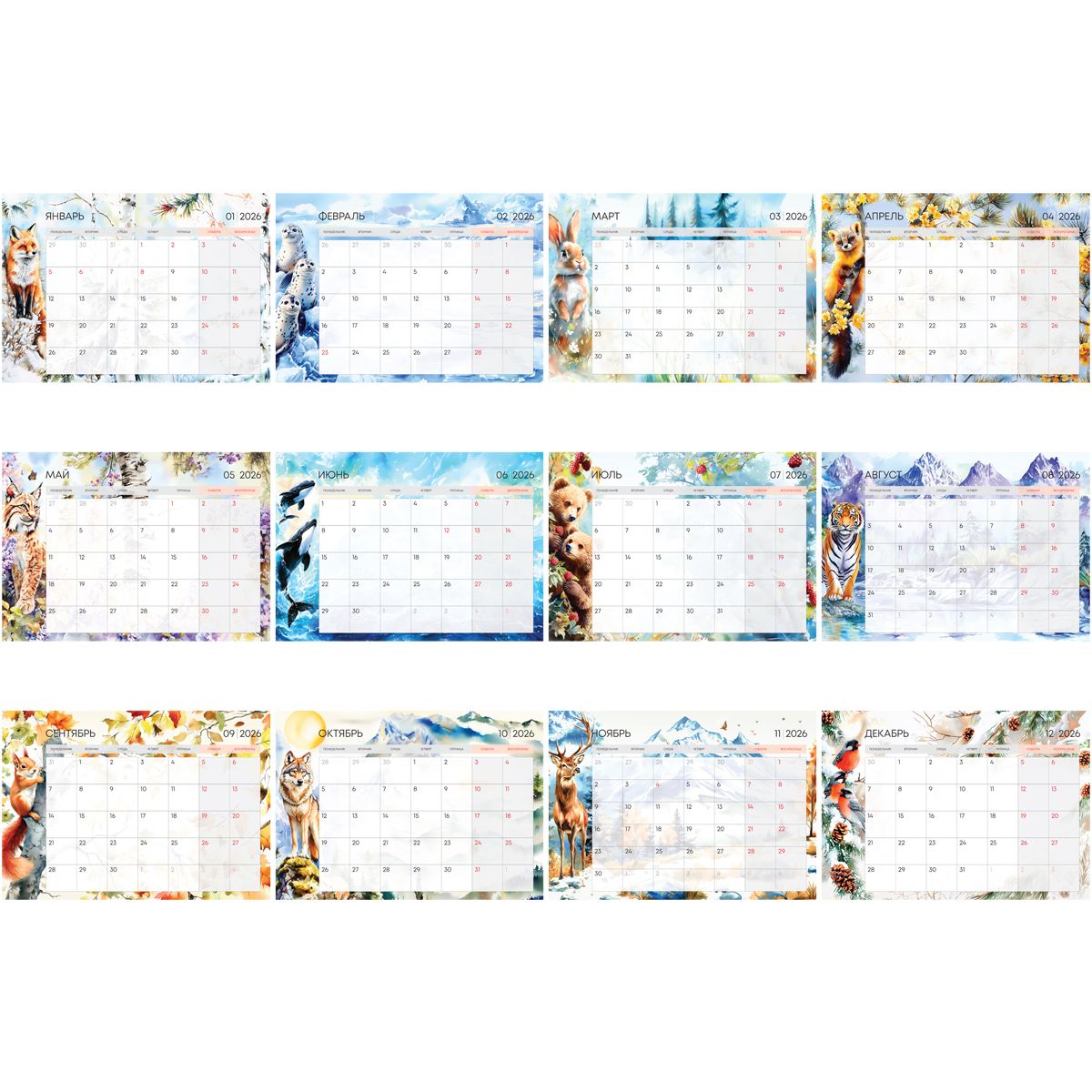 Календарь-планер настенный перекидной на гребне, А4, 12л. BG "Животные", 2026г.