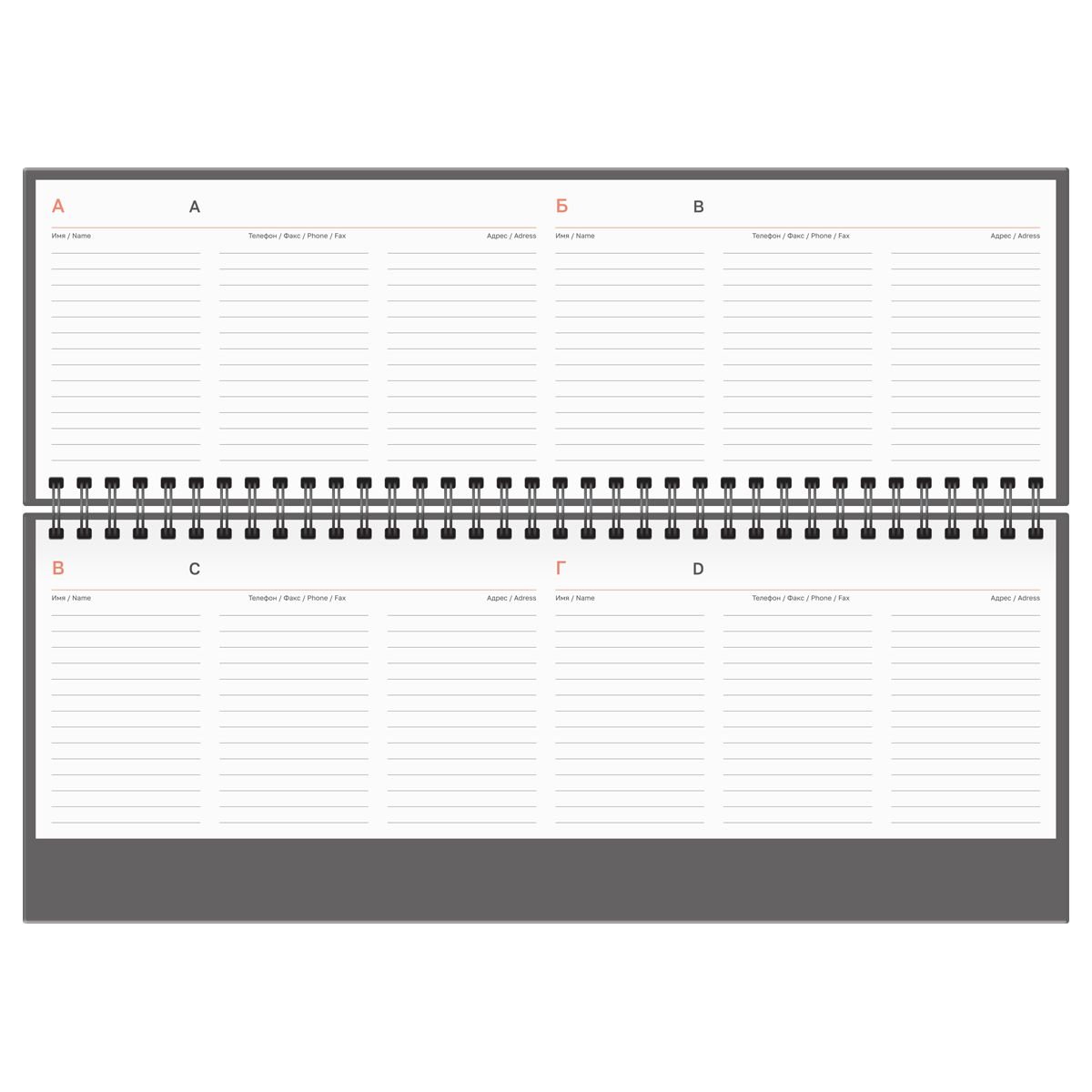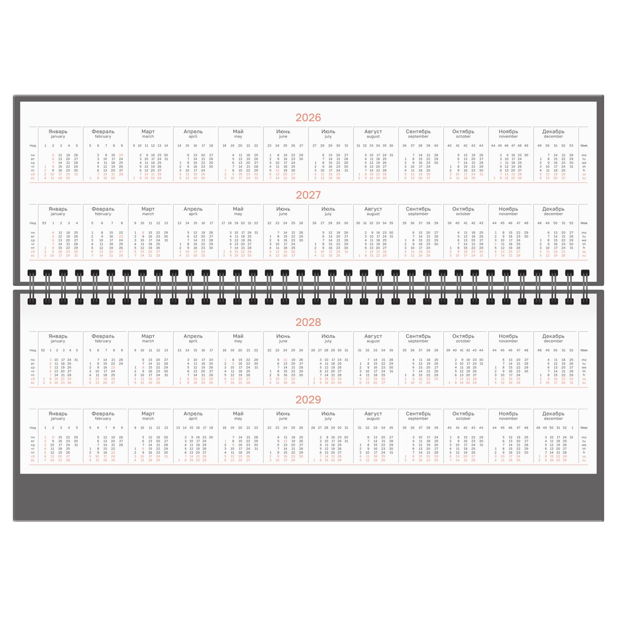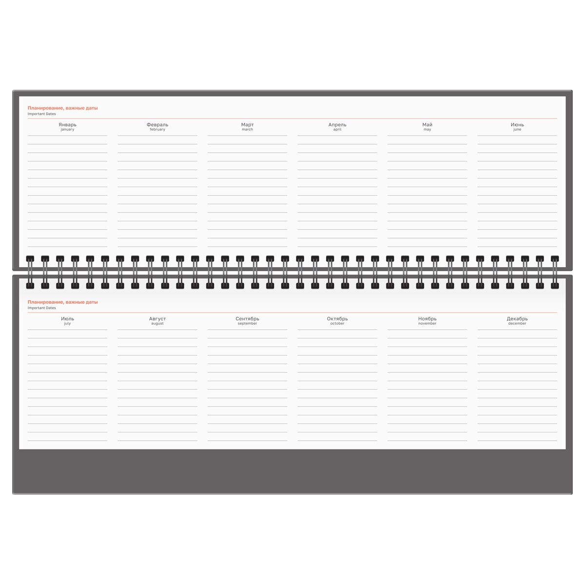 Планинг содержит календарные разделы на каждый месяц с датами и праздниками, чтобы вы не пропустили ни одной важной даты или события. Кроме блоков для важных задач и заметок, он включает телефонную книгу и календарь на четыре года.