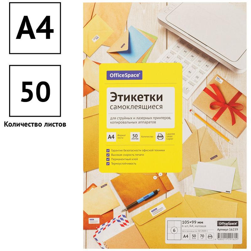 Этикетки самоклеящиеся А4 50л. OfficeSpace, белые, 06 фр. (105*99), 70г/м2