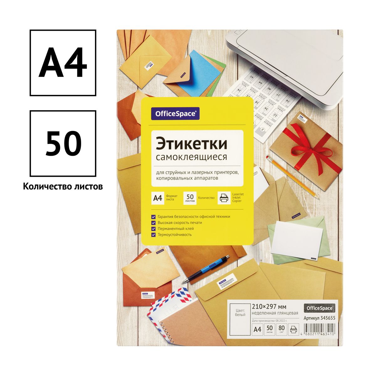 Этикетки самоклеящиеся А4 50л. OfficeSpace, белые, неделен., глянцевая, 80г/м2