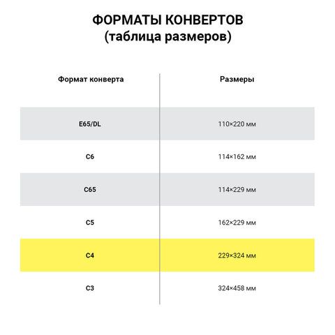 - Конверты доступны в форматах: C4, C5, C6 и E65.
