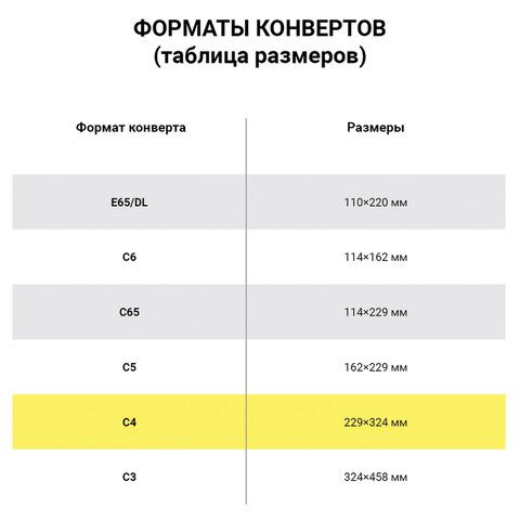 - Конверты доступны в форматах: C4, C5, C6 и E65.