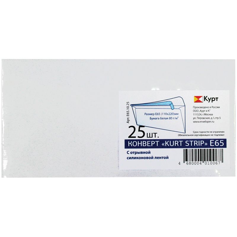 Конверт E65, KurtStrip, 110*220мм, б/подсказа, б/окна, отр. лента, внутр. запечатка, термоусадка