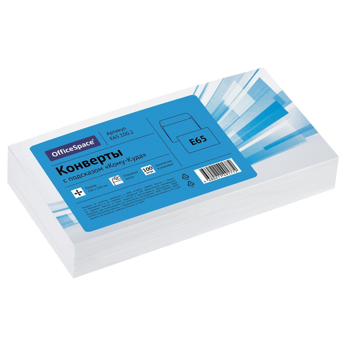 Конверт E65, OfficeSpace, 110*220мм, с подсказом, б/окна, отр. лента, термоусадка