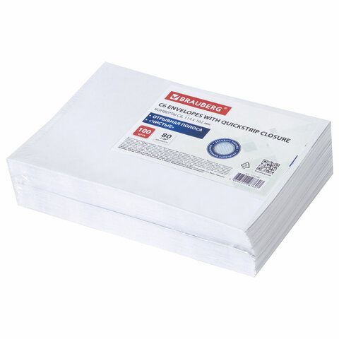 Конверты С6 (114х162 мм), отрывная лента, внутренняя запечатка, 80 г/м2, КОМПЛЕКТ 100 шт., BRAUBERG, 112190, С6НКРс(BRAUBERG