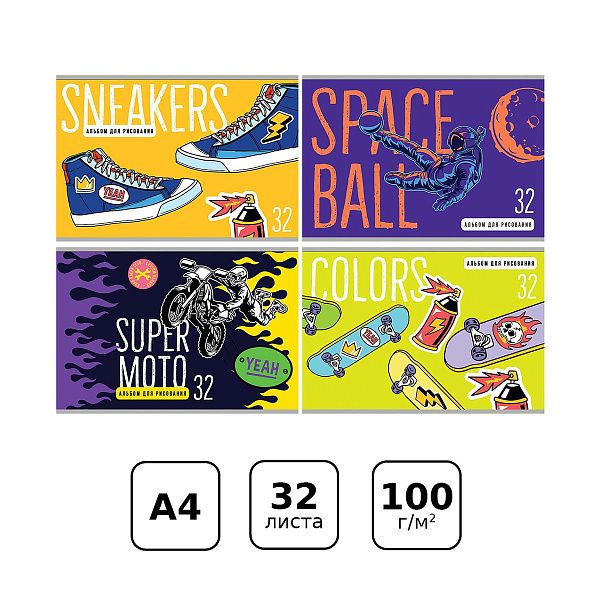 - Альбомы для рисования: листы А4 и А3 для карандашей, красок и маркеров.