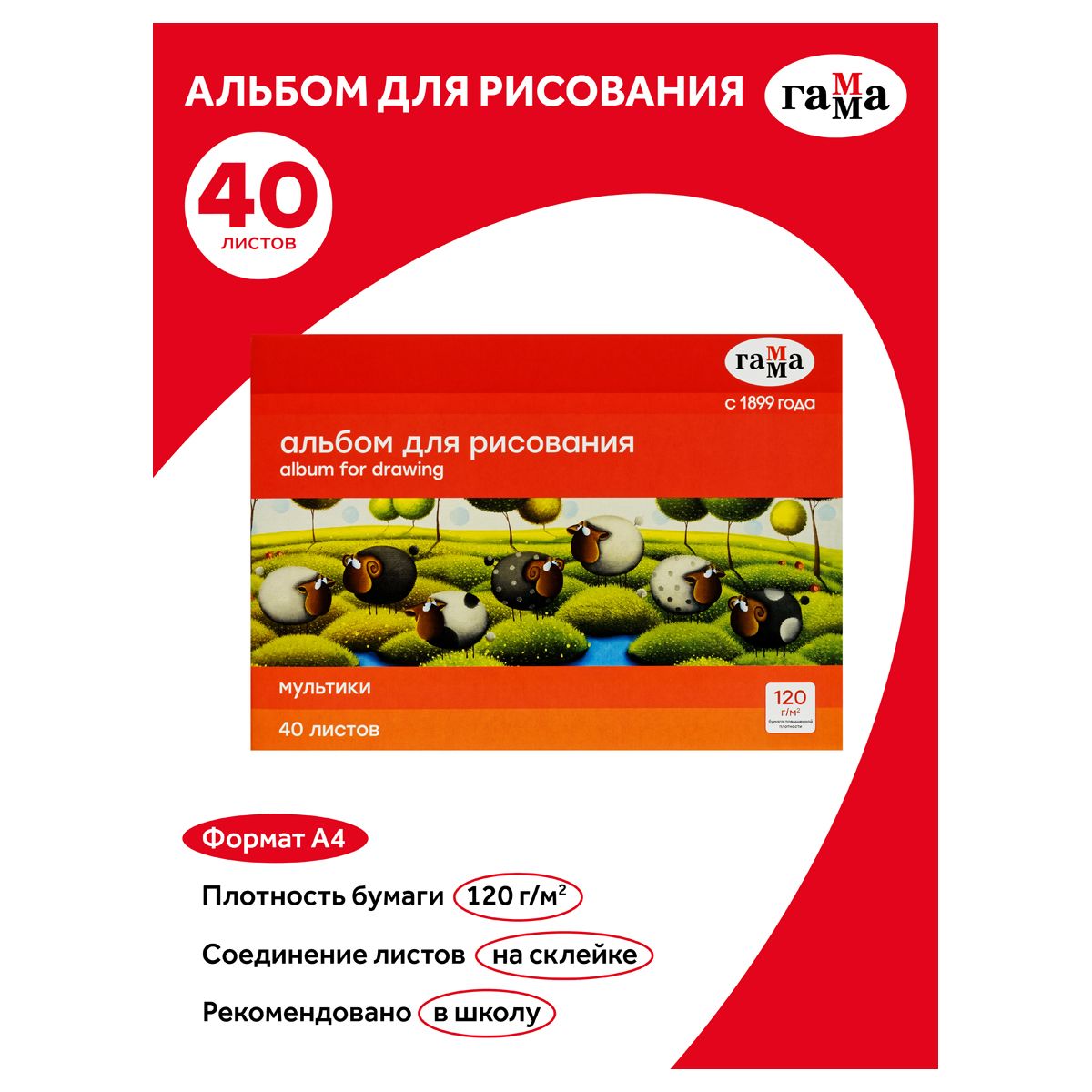 Альбом для рисования 40л., А4, на склейке Гамма "Мультики", 120г/м2
