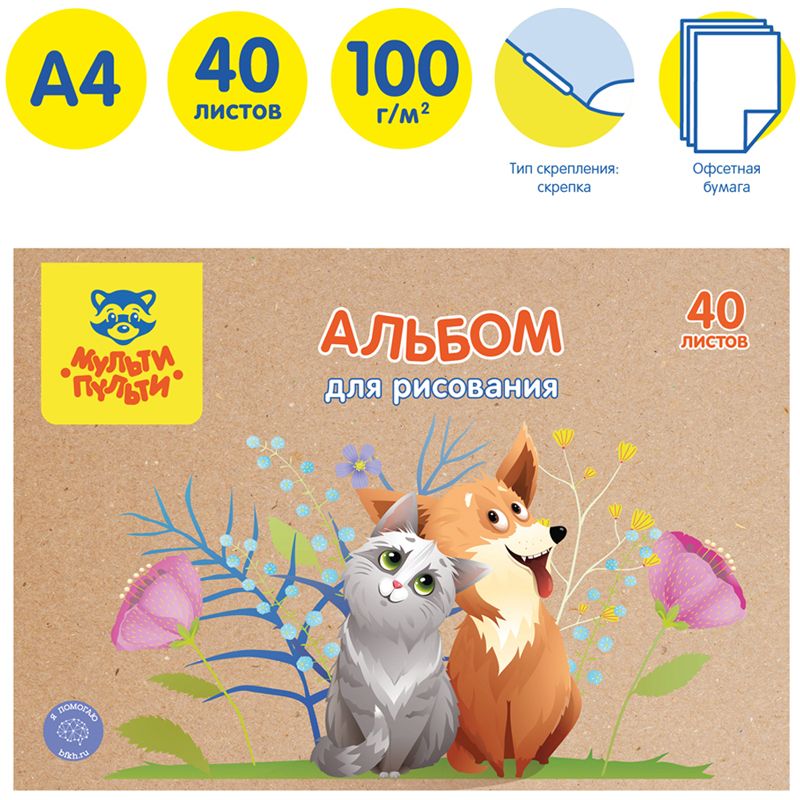 Альбом для рисования 40л., А4, на скрепке Мульти-Пульти "Питомцы", крафт картон