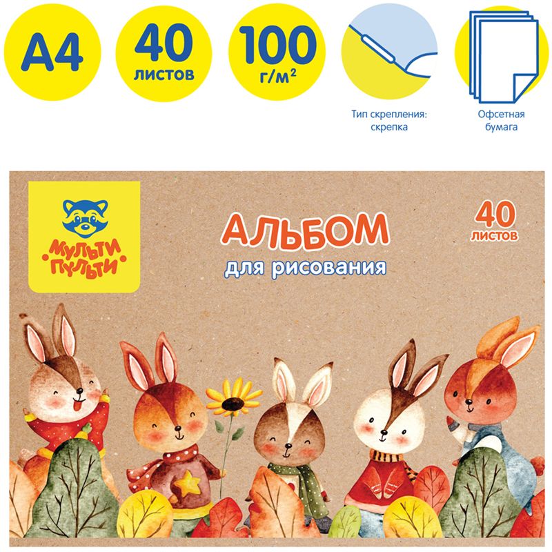 Альбом для рисования 40л., А4, на скрепке Мульти-Пульти "Зайчики", крафт картон