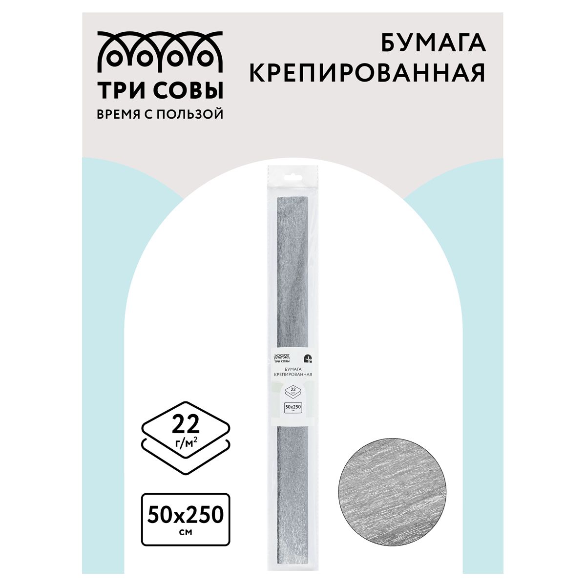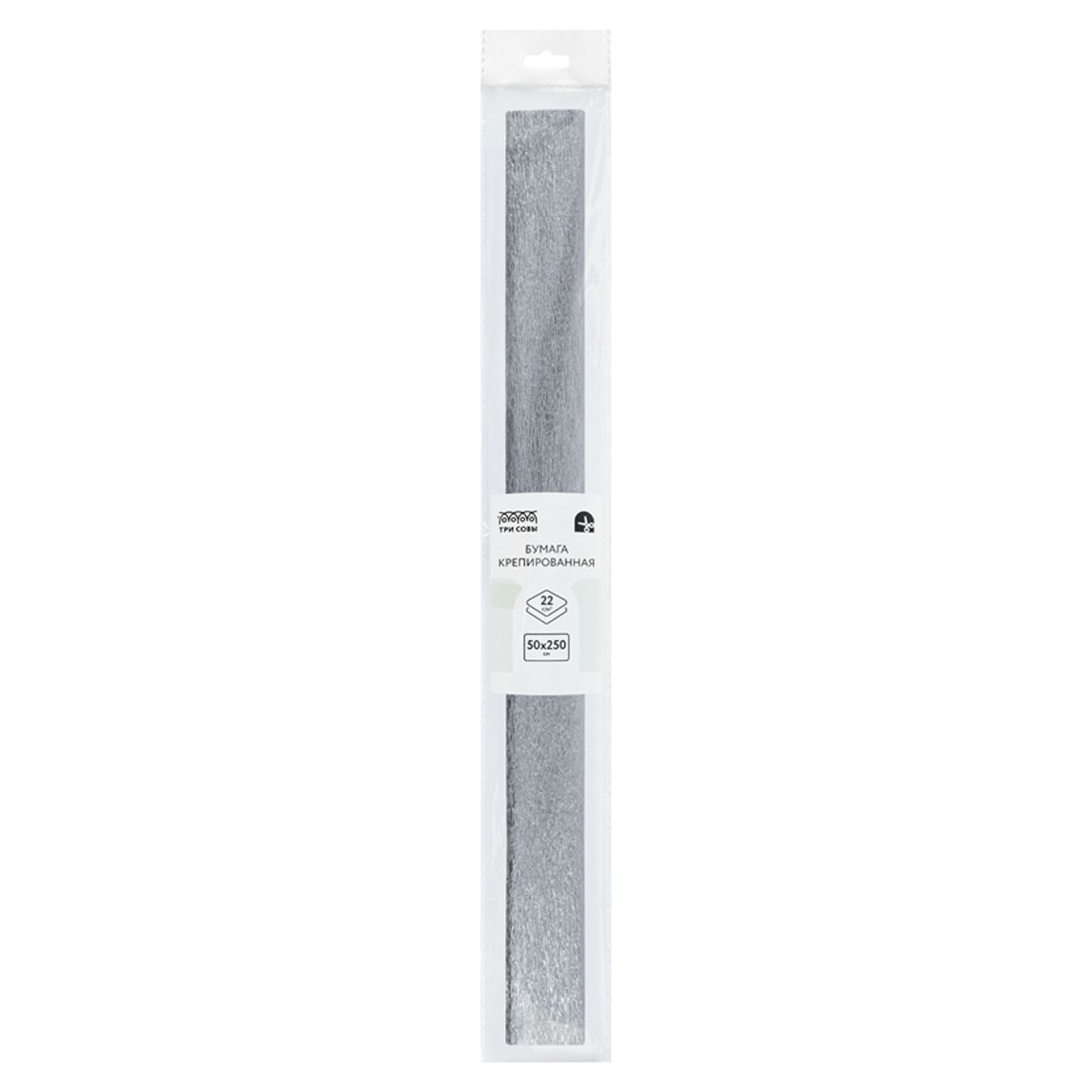 Бумага крепированная ТРИ СОВЫ, 50*250см, 22г/м2, серебряная, в рулоне, пакет с европодвесом