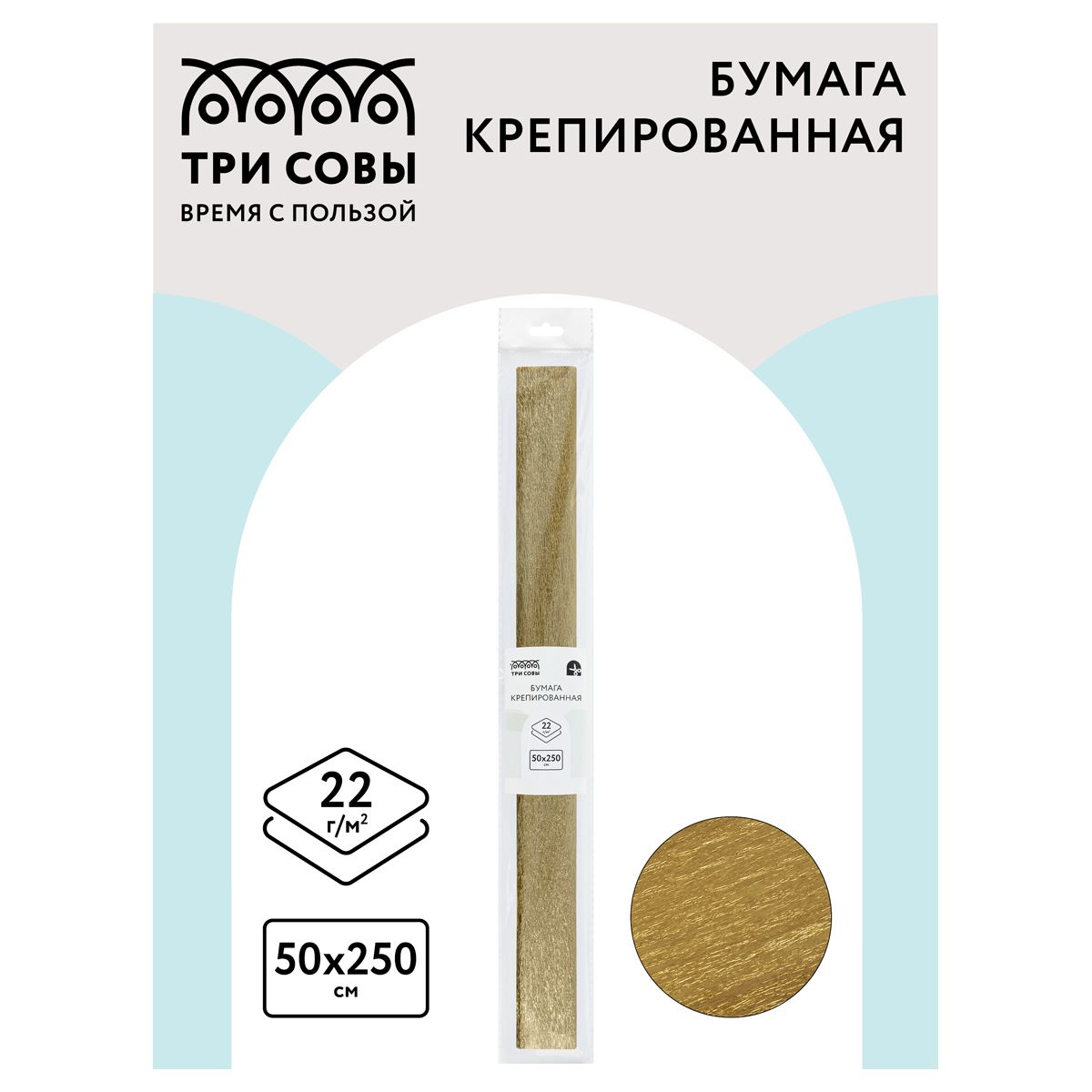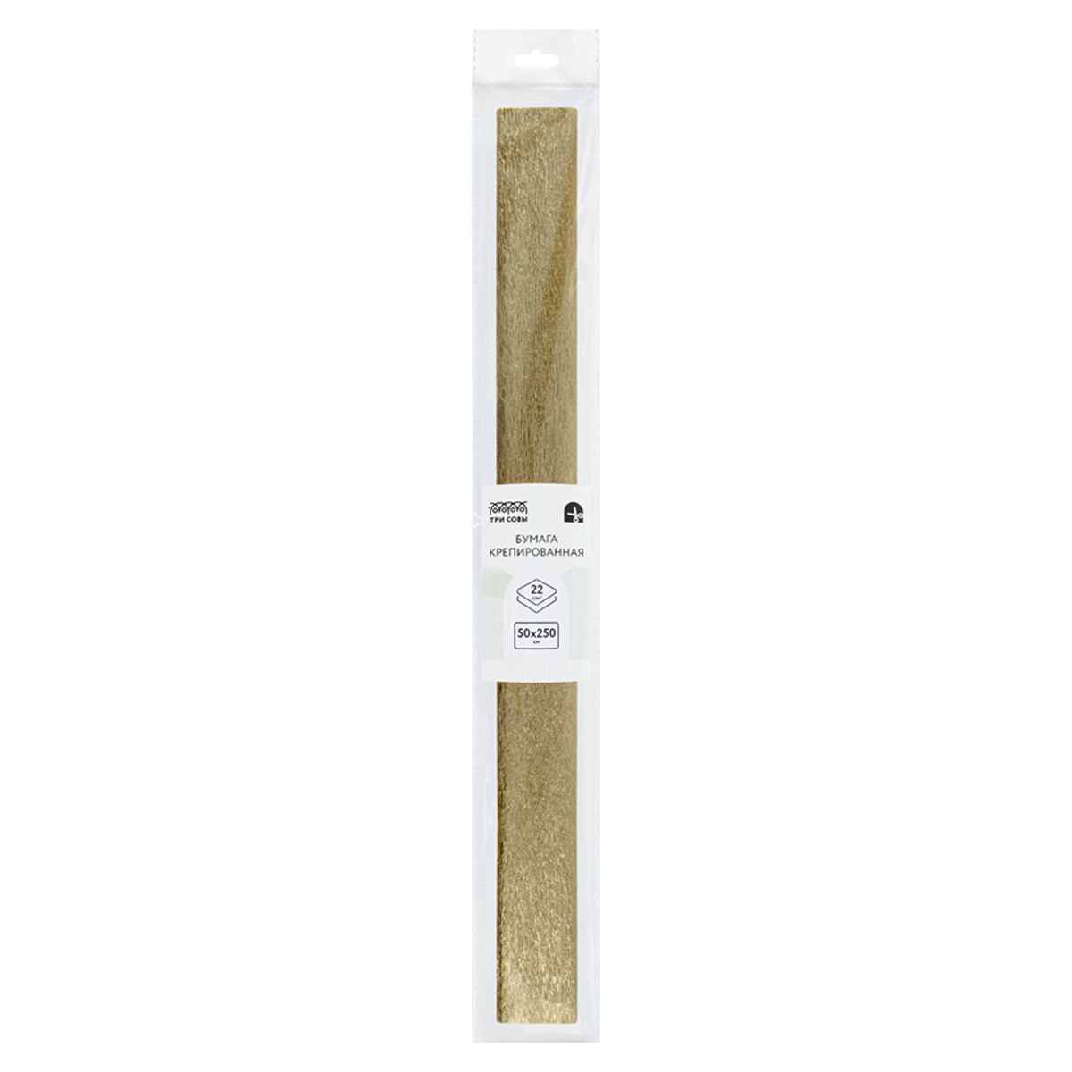 Бумага крепированная ТРИ СОВЫ, 50*250см, 22г/м2, золотая, в рулоне, пакет с европодвесом