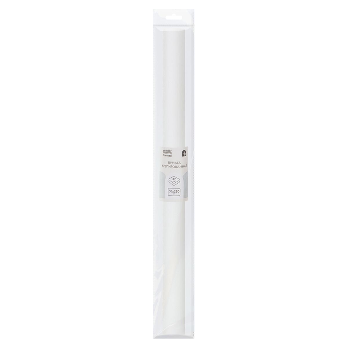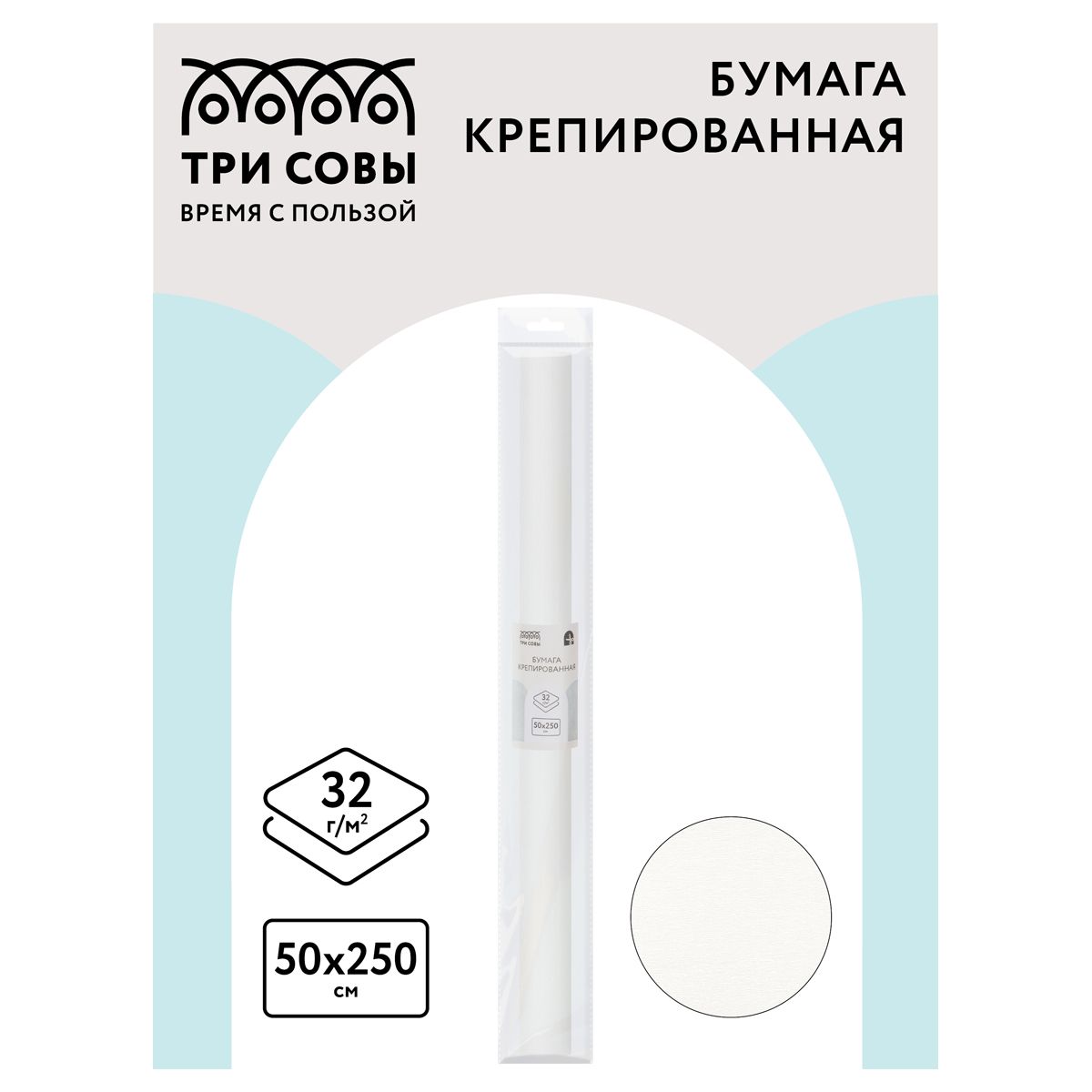 Бумага крепированная ТРИ СОВЫ, 50*250см, 32г/м2, белая, в рулоне, пакет с европодвесом