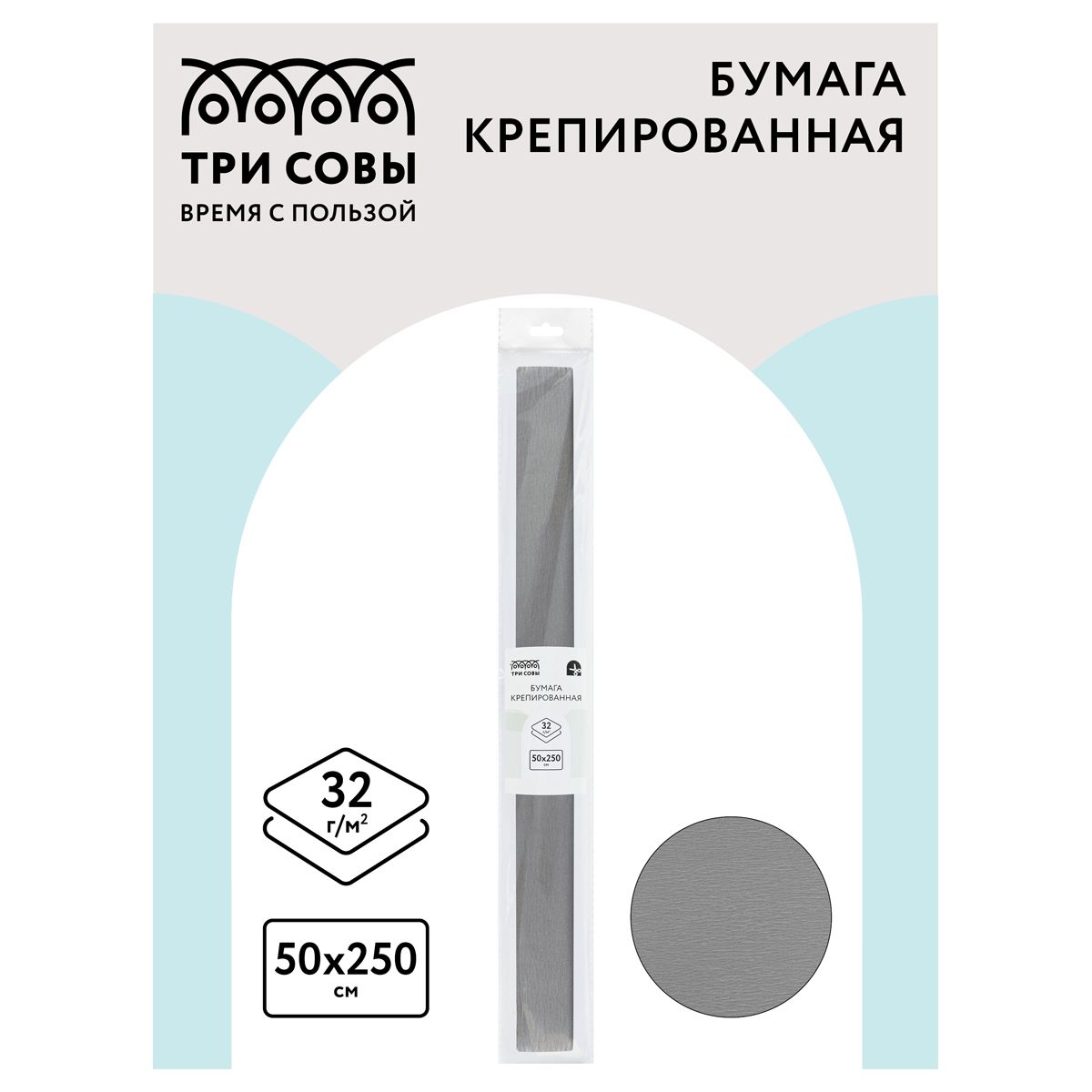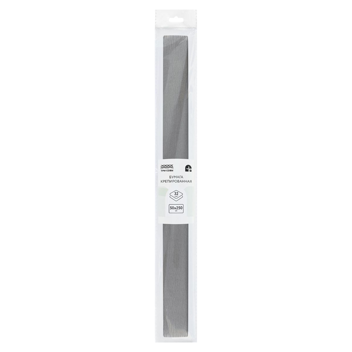 Бумага крепированная ТРИ СОВЫ, 50*250см, 32г/м2, серая, в рулоне, пакет с европодвесом