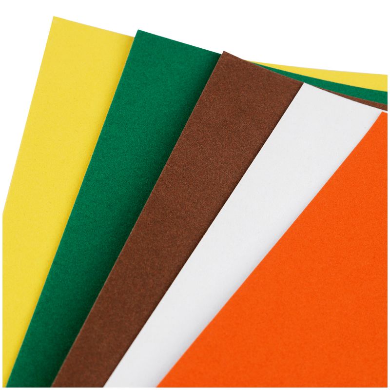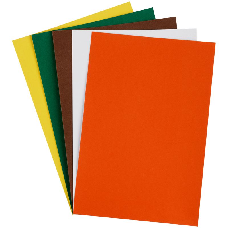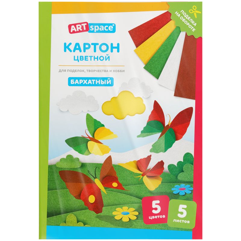 В папке представлено 5 листов 5-ти ярких цветов бархатного картона, размером 210*297 мм. Плотность картона: 280 г/кв.м.