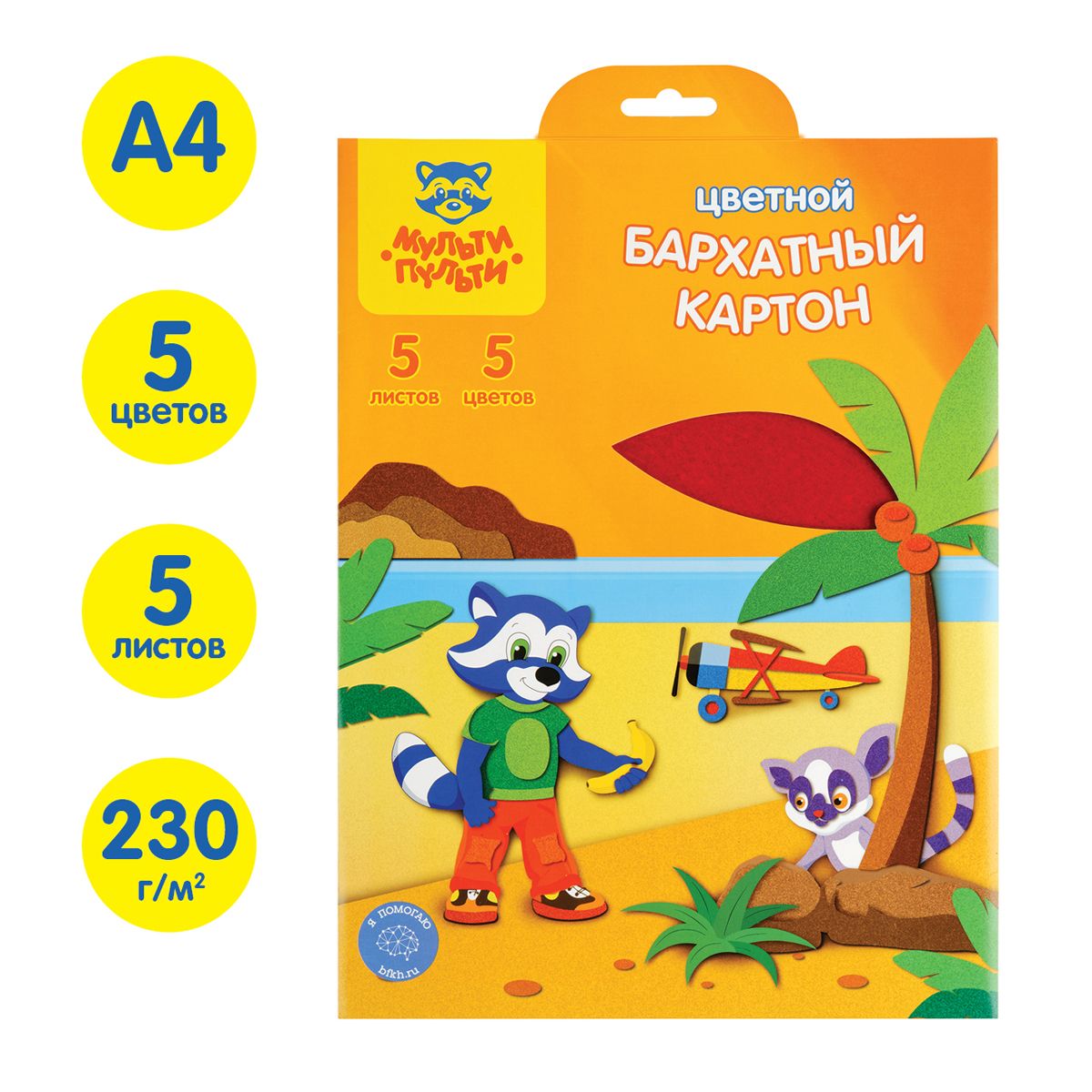 Картон бархатный А4, Мульти-Пульти, 5л., 5цв., в папке, "Приключения Енота"