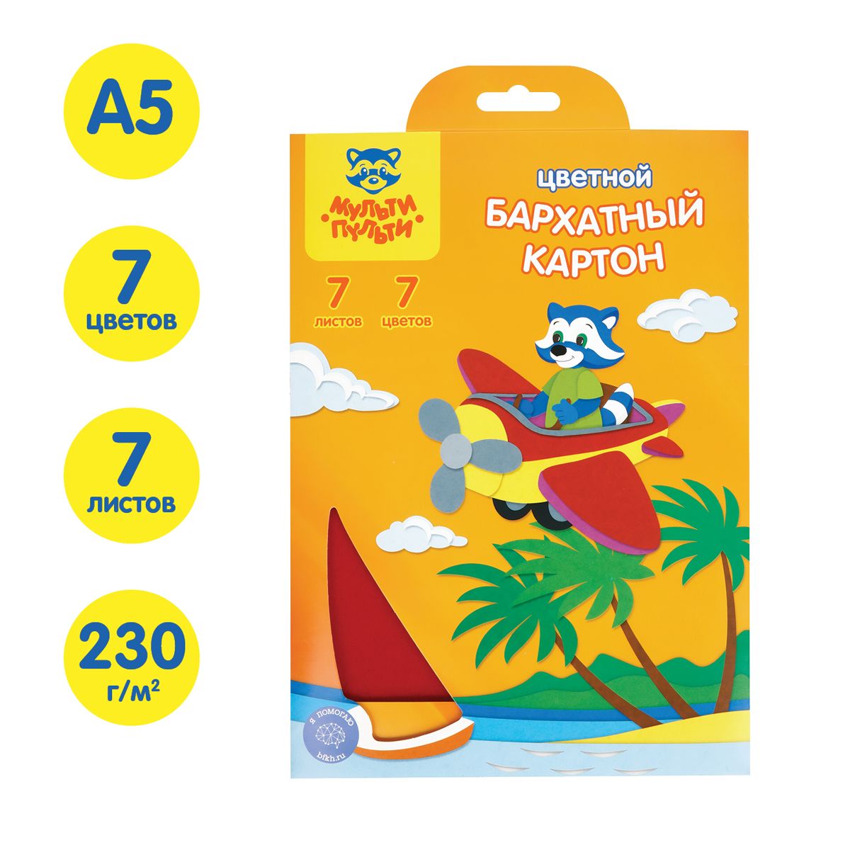 Картон бархатный А5, Мульти-Пульти, 7л., 7цв., в папке с европодвесом, "Приключения Енота"