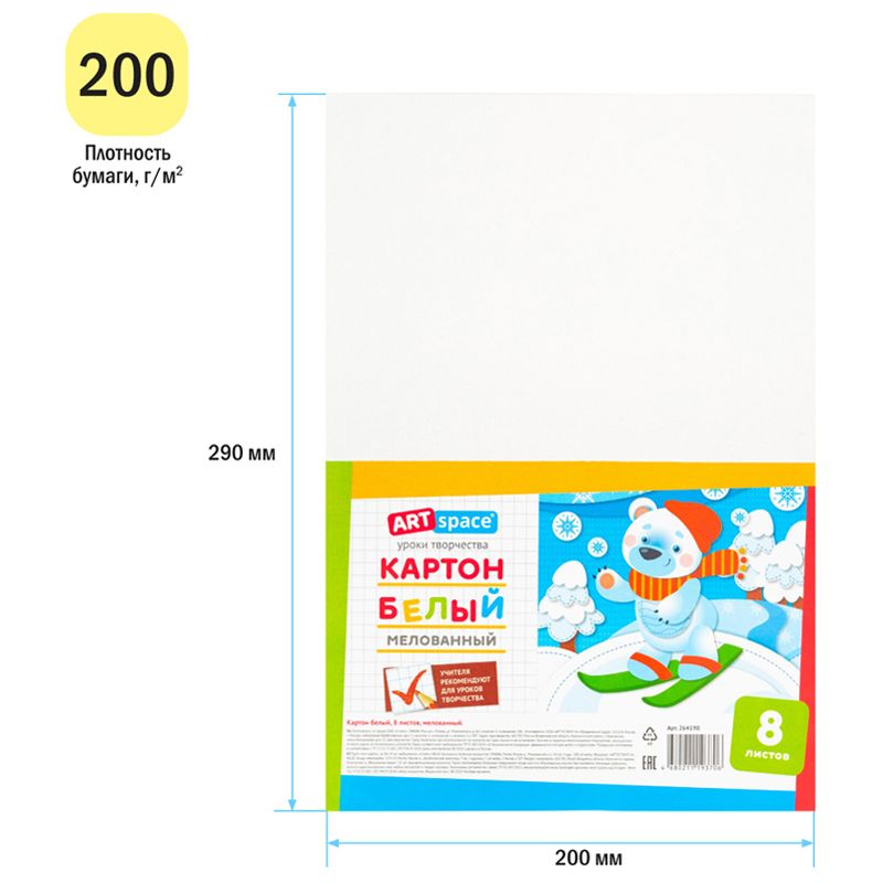 Картон белый А4, ArtSpace, 8л., мелованный, в пакете