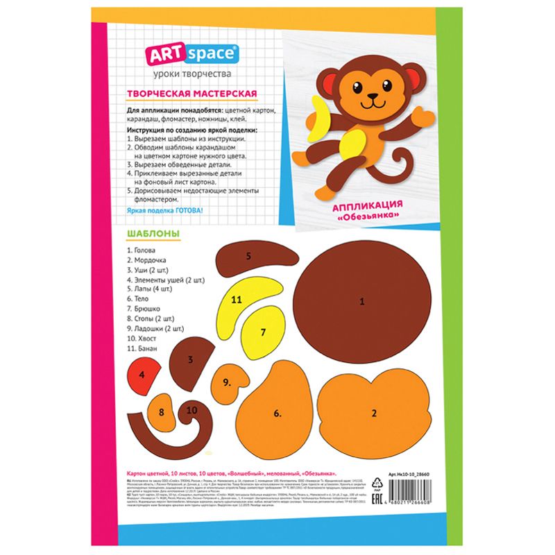 Картон цветной А4, ArtSpace, 10л., 10цв., мелованный, золото, серебро, в папке, "Волшебный. Обезьянка"