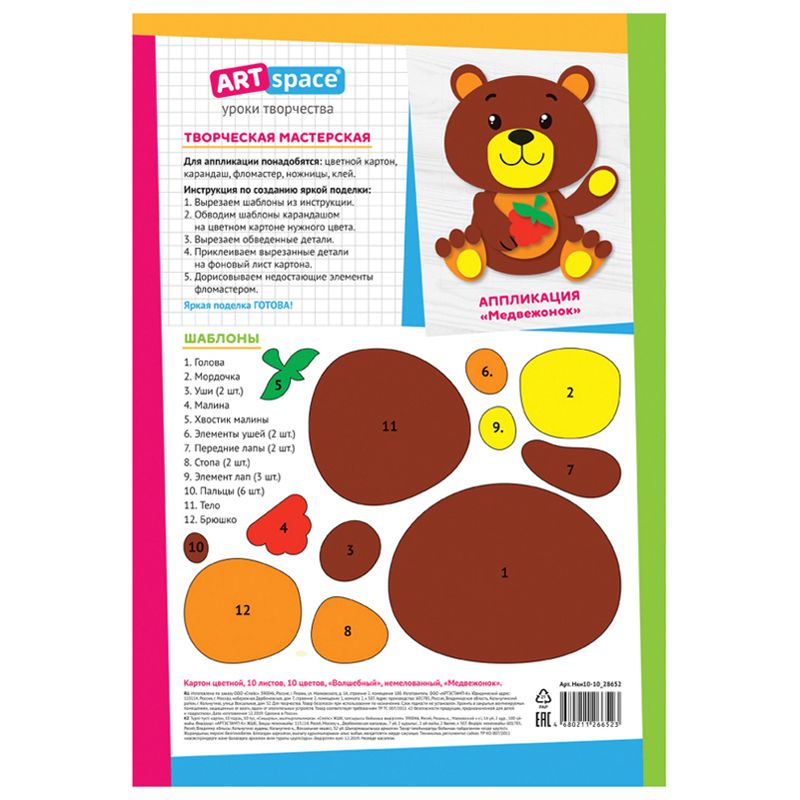 Картон цветной А4, ArtSpace, 10л., 10цв., немелованный, золото, серебро, в папке, "Волшебный. Медвежонок"
