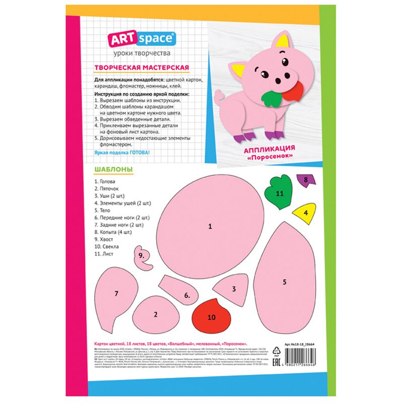 Картон цветной А4, ArtSpace, 18л., 18цв., мелованный, золото, серебро, в папке, "Волшебный. Поросенок"