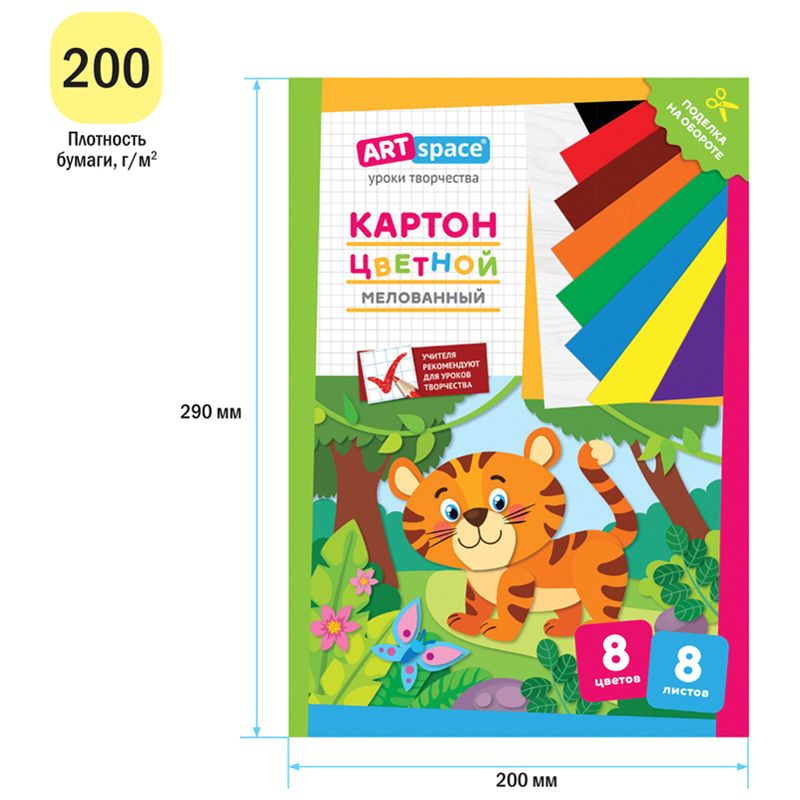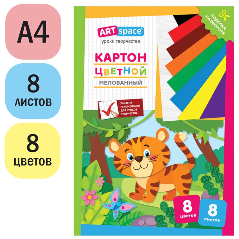 Картон цветной А4, ArtSpace, 8л., 8цв., мелованный, в папке, "Тигренок"
