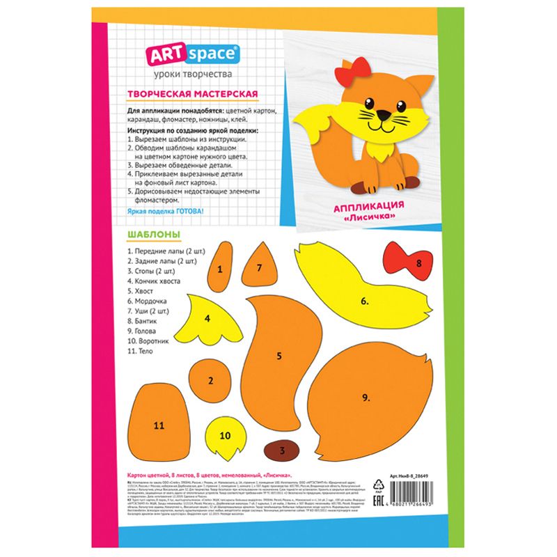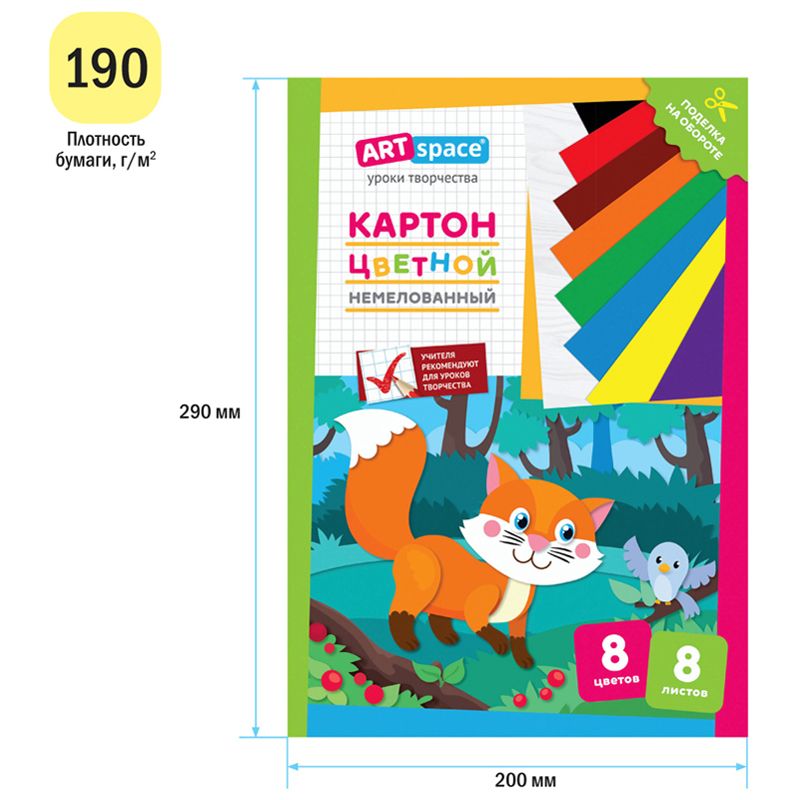 Картон цветной А4, ArtSpace, 8л., 8цв., немелованный, в папке, "Лисичка"
