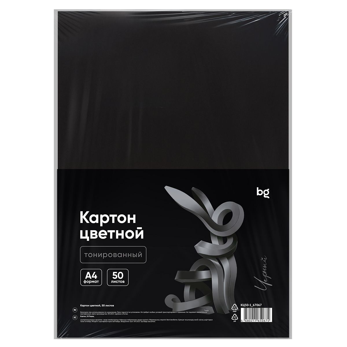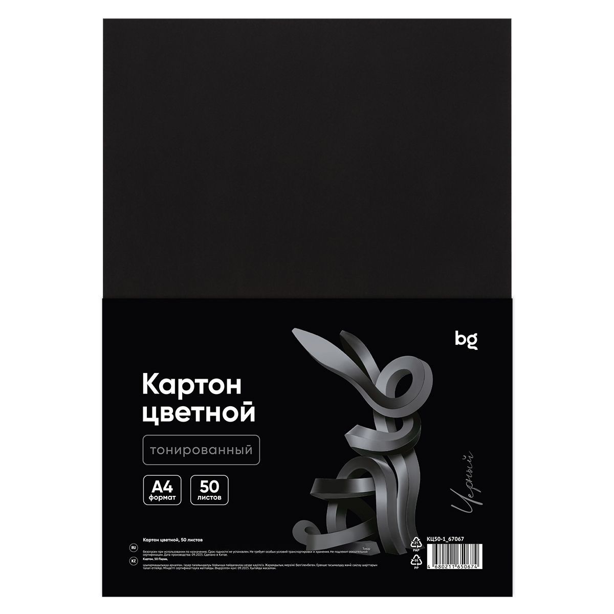 Картон цветной А4, BG, 50л., тонированный, черный, 220г/м2