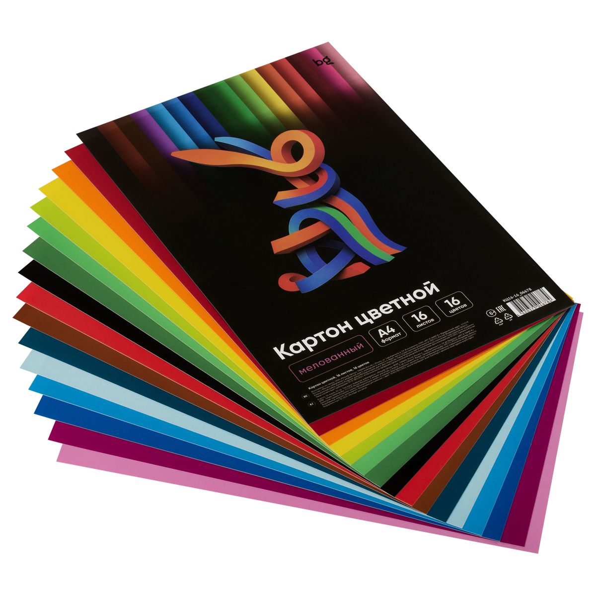 Картон цветной, А4 двустор., BG, 16 л., 16 цв., мелованный, в пакете