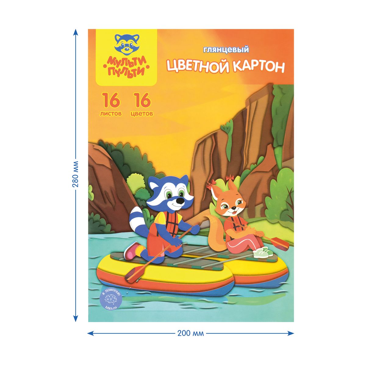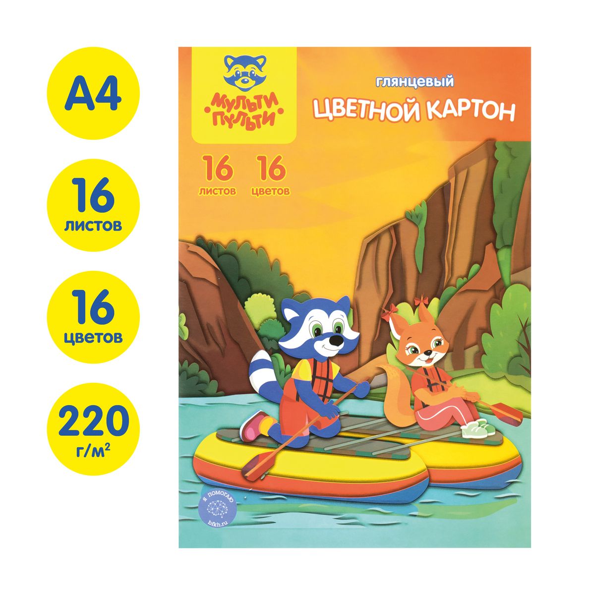Картон цветной А4, Мульти-Пульти, 16л., 16цв., мелованный, в папке, "Приключения Енота"