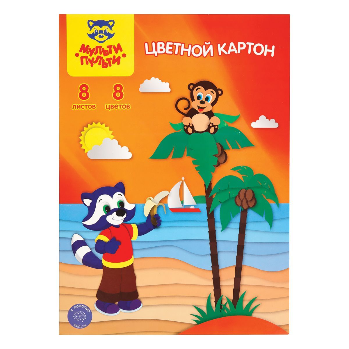 Картон цветной А4, Мульти-Пульти, 8л., 8цв., немелованный, в папке, "Приключения Енота"
