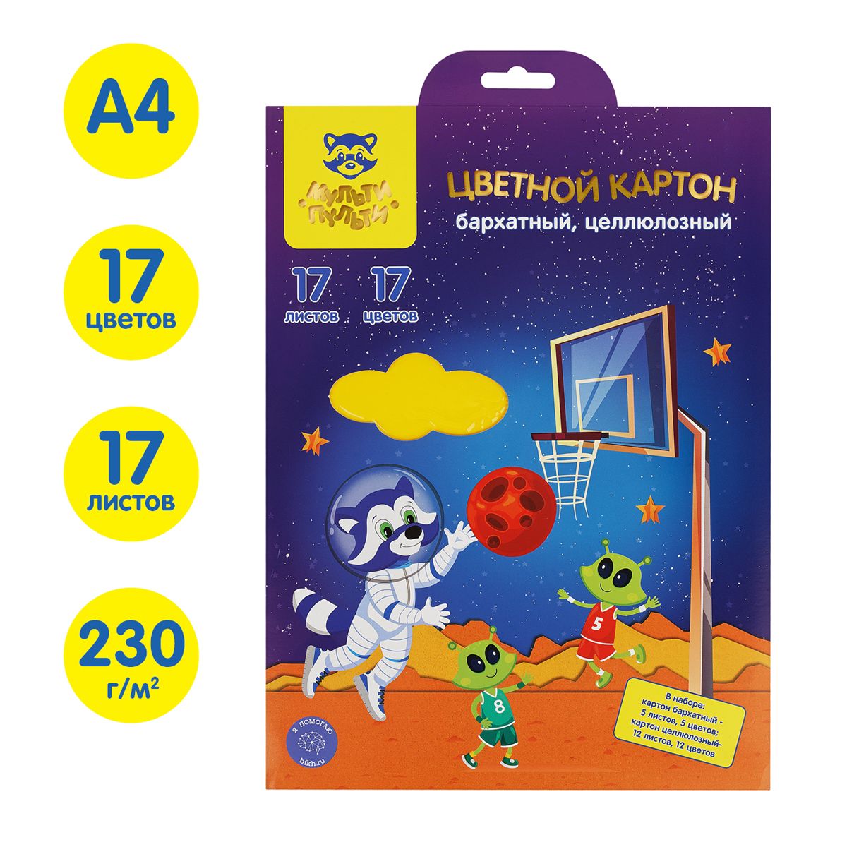 Картон цветной А4, Мульти-Пульти, микс бархатных 5л., 5цв., и целлюлозных 12л., 12цв., "Енот в космосе"
